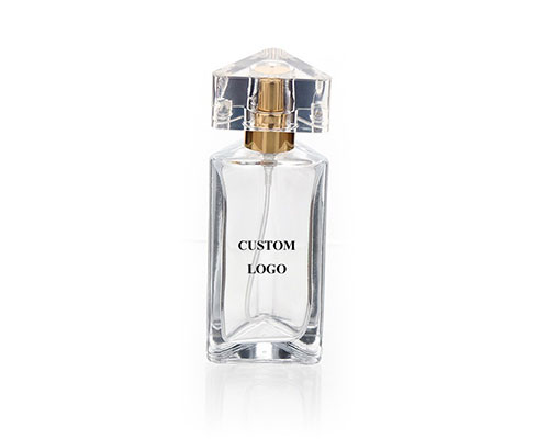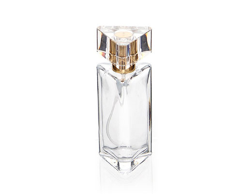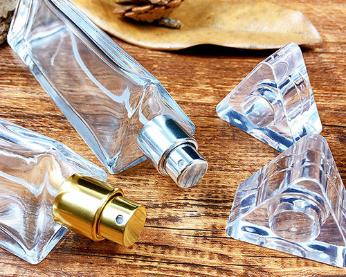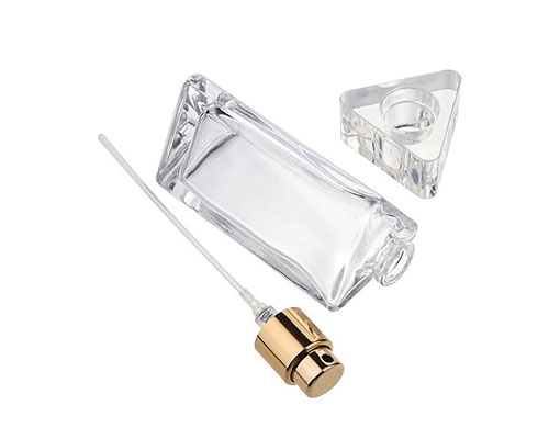 The triangular perfume bottle is made of thickened glass. The base and lid are designed with a triangular shape and a sense of lines. Empty glass perfume bottle equips with gold or silver spray pump and clear lid.