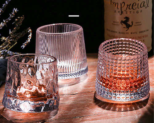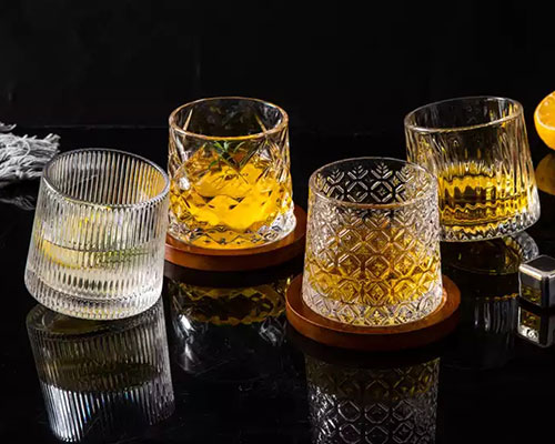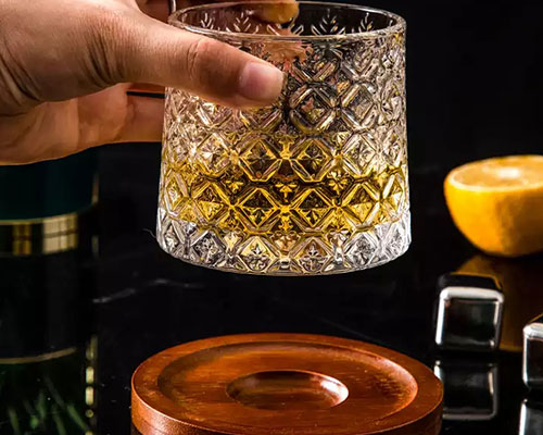 In addition to flat-bottomed whiskey glass cups, we also offer wholesale creative revolving glass cups and wooden bases. These whisky glasses have excellent domed bottoms for easy rotation.