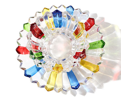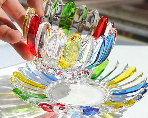 - The colored glass plates and bowls feature flower-shaped designs, and colorful patterns make each plate and bowl look like a work of art.